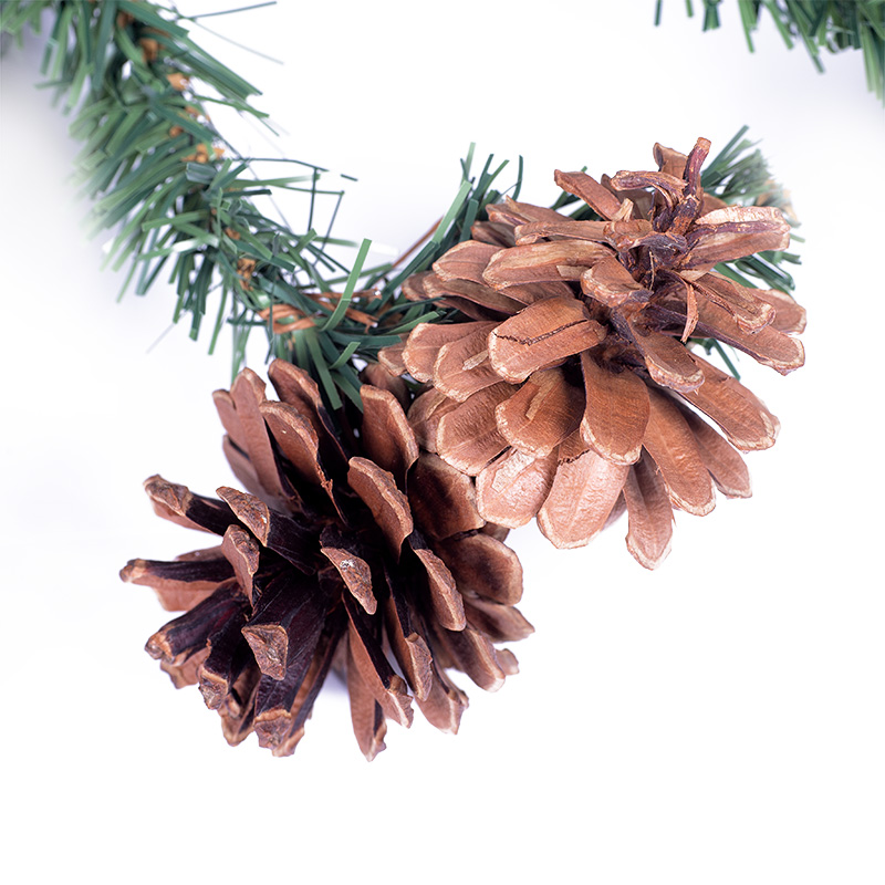 дополнена шишками, что увеличивает реалистичность исполнения. Новогодний декор сплетен из искусственных хвойных ветвей, диаметр гирлянды 36 см.