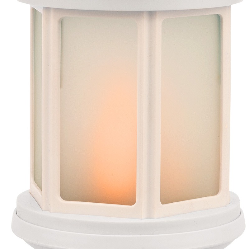 Декоративный фонарь с эффектом пламени свечи отличается стильным оформлением и необычным дизайном: свечка помещена в классический корпус белого цвета. Стекла с матовой поверхностью мягко рассеивают яркий поток, создавая комфортное для глаз свечение. Для подвешивания предусмотрено кольцо. За подсветку отвечает 21 белый диод, который экономно расходует заряд 2 батареек типа АА. Отсек для элементов питания находится в нижней части корпуса и надежно закрывается крышкой. Кнопка ON/OFF включает и выключает свечение.