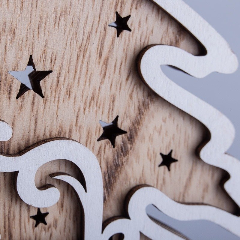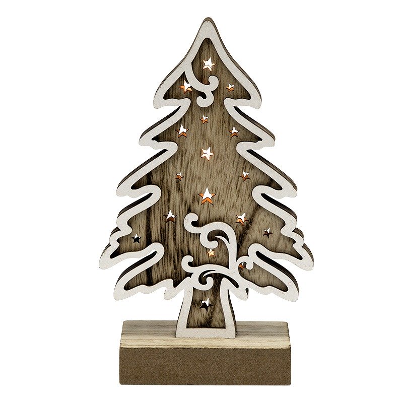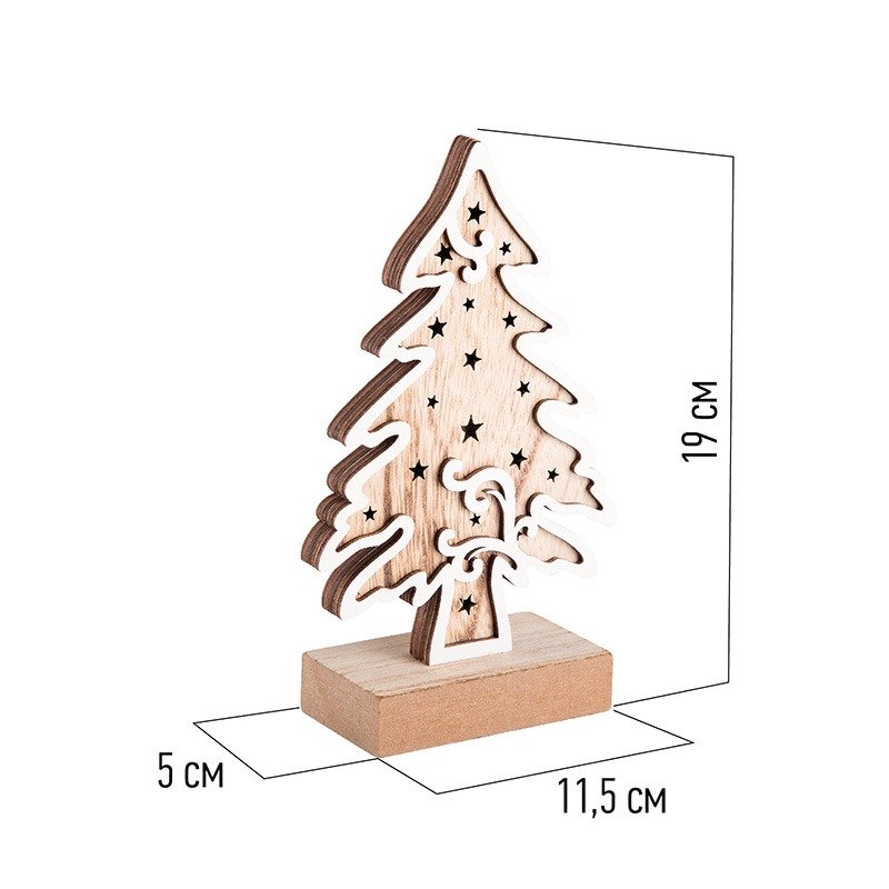 Деревянная фигурка с подсветкой «Елочка» 11,5×5×19 см — оригинальное интерьерное украшение, которое подарит ощущение уюта и тепла, создаваемое аутентичной фактурой дерева и мягким свечением трех диодов. Декоративное изделие работает от 2 батареек типа ААА. Светодиоды экономно расходуют заряд, превращая всю энергию в свет и не нагреваются. В нижней части корпуса предусмотрена клавиша включения и выключения. Деревянная фигурка с подсветкой станет прекрасным подарком к Новому году и Рождеству.