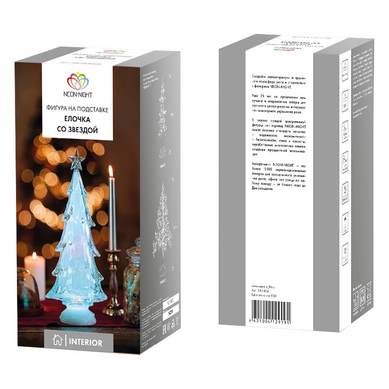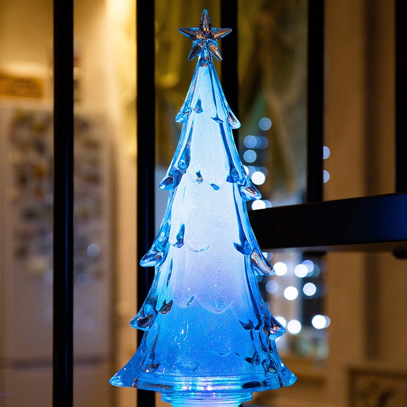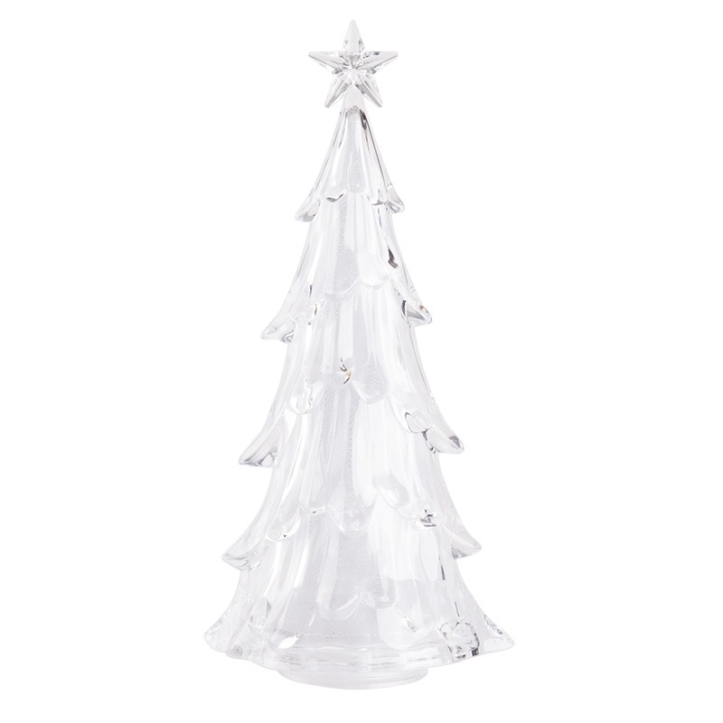 Фигура на подставке «Елочка со звездой» высотой 37 см станет великолепным украшением интерьера, который погрузит вас в атмосферу волшебной зимней сказки и подарит веселое праздничное настроение. Настольный декор выполнен в виде объемной новогодней ели, увенчанной звездой. Материал изготовления — прочный прозрачный пластик. В нижней части устойчивой подставки располагаются батарейный блок для 4 элементов питания типа ААА и удобная клавиша включения, выключения подсветки. Один экономичный светодиод RGB светится разными цветами, плавно меняя оттенки.