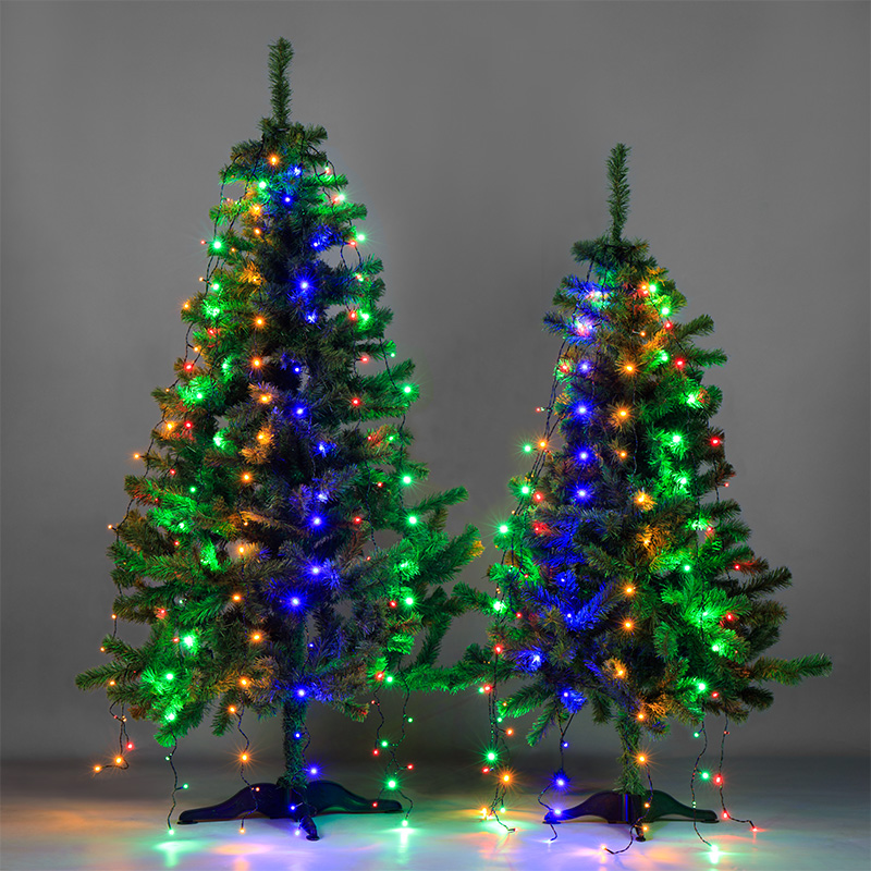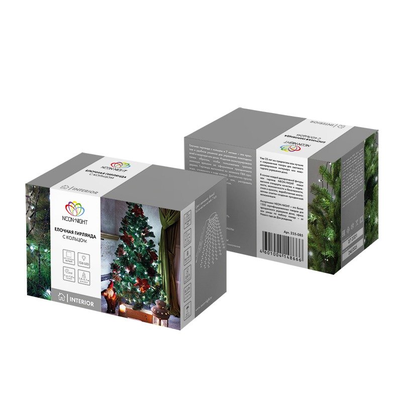 Елочная гирлянда с кольцом и 7 нитями по 1,8 м питается от электросети с напряжением 230 Вольт через трехметровый кабель. Штепсельная вилка совместима со всеми розетками. Гирлянда предназначена для украшения новогодних елок в интерьере. В конструкции 126 диодов, светящихся синим, зеленым, красным и желтым цветами. Главное преимущество изделия — простота использования: достаточно надеть кольцо на вершину ели и расправить нити — оригинальный праздничный декор готов. Диоды не нагреваются и подходят для оформления искусственных деревьев. Контроллер с 8 режимами позволяет менять динамику свечения в соответствии с обстановкой.