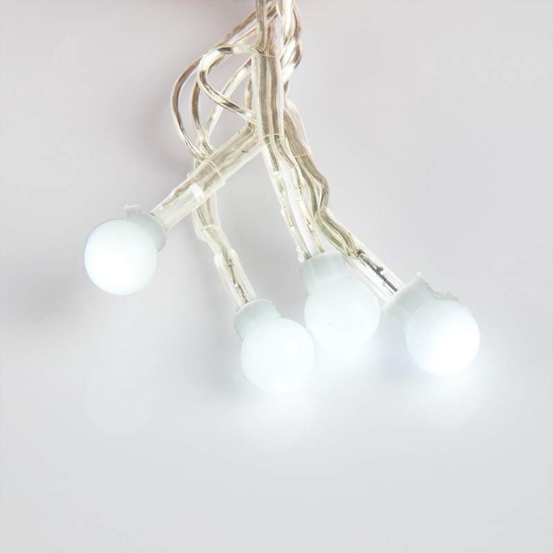 Гирлянда «Мишура» длиной 3 метра выполнена в виде объемной пушистой елочной мишуры. На концах многочисленных отводов расположены пластиковые шарики диаметром 1 см, внутри которых находятся светодиоды. Всего в изделии 288 диодов, излучающих белый свет нейтрального оттенка. Серебристый провод покрыт изоляцией из прозрачного ПВХ. Есть возможность собрать украшение длиной до 60 метров, соединив несколько гирлянд при помощи удобного разъема. Для подключения к электросети предусмотрен трехметровый кабель с контроллером. Устройство управления имеет 8 предустановленных режимов свечения с разной динамикой.
