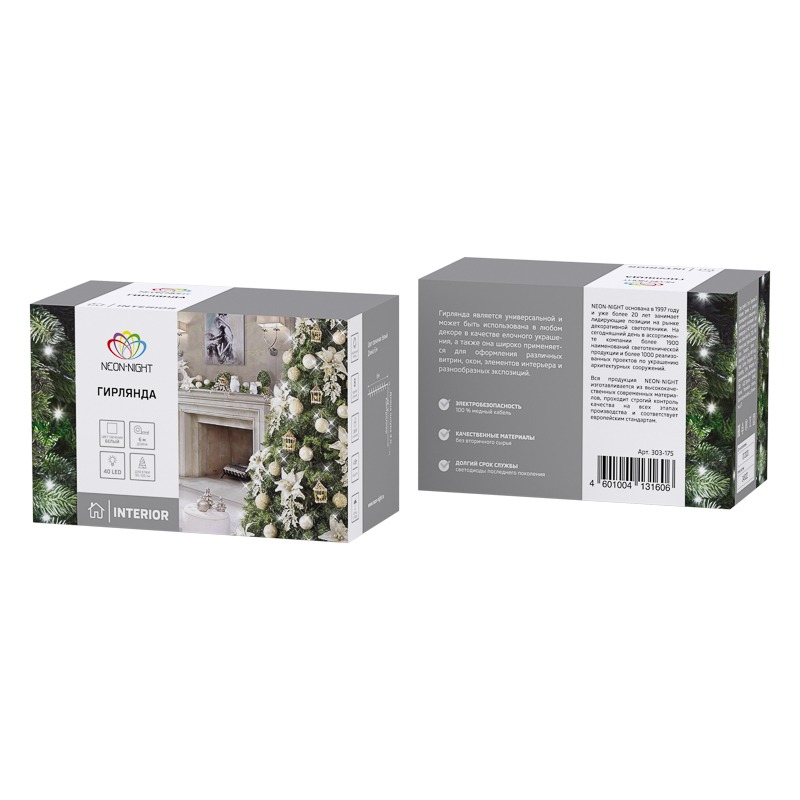 Гирлянда «Твинкл» длиной 6 метров — это современное безопасное украшение новогодней ели, без которого невозможно представить Рождественские праздники. 40 ярких диодов белого свечения создают настроение гостям, способствуют уютной, комфортной атмосфере, помогают эффектно подчеркнуть дизайн интерьера и неповторимый стиль обстановки. В основе изделия находится серебристый провод с изоляцией из прозрачного ПВХ. Электрический кабель длиной 3 метра позволяет подключить изделие к розетке в любом удобном месте. Режимы свечения переключаются кнопкой на контроллере. Устройство управления имеет 8 разных встроенных режимов.