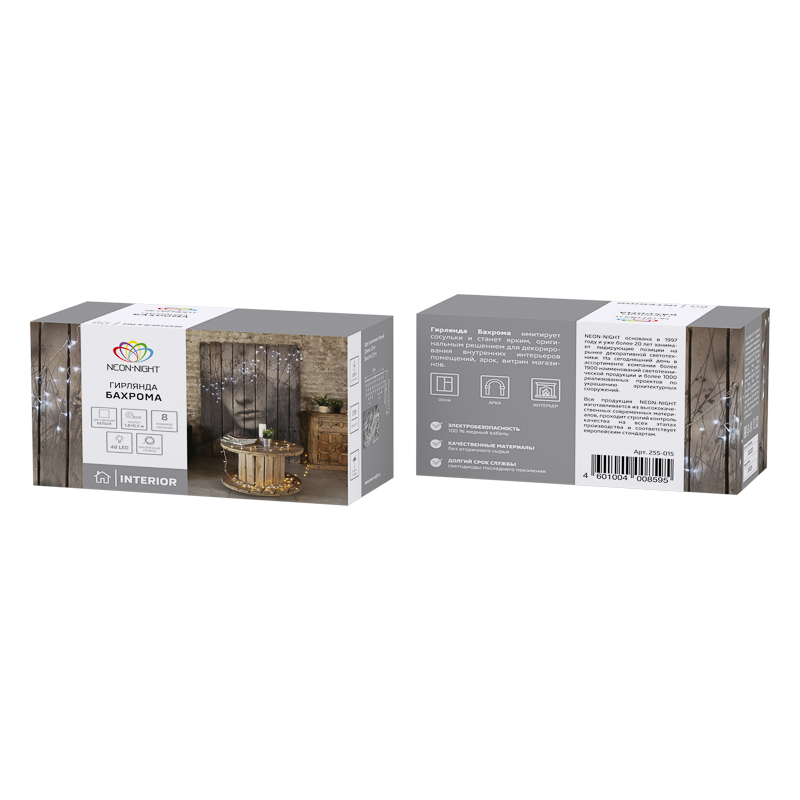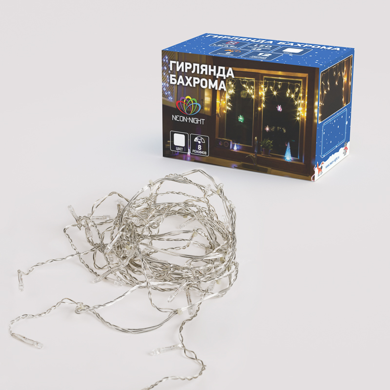 Светодиодная гирлянда «Айсикл» 1,8×0,5 м — оригинальное украшение для оформления гардин, ниш, открытых проемов между комнатами, которое выгодно подчеркнет элементы дизайна интерьера и отобразит индивидуальный вкус хозяев дома. Гирлянда выполнена в виде бахромы: на кабеле-основе расположены свисающие нити разной длины (от 10 до 50 см). Серебристый шнур в прозрачной оболочке из ПВХ практически незаметен на общем фоне и, подсвечиваемый 48 диодами, образует гармоничную яркую композицию. Контроллер на 8 режимов управляет ритмом свечения белых светодиодов.