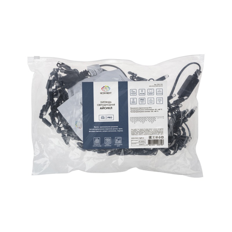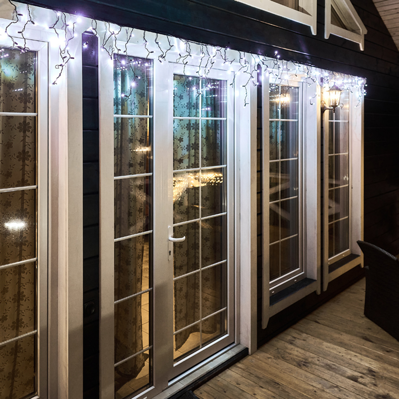 Гирлянда "Бахрома" ("Айсикл") представляет собой гибкий горизонтальный шнур-шину, к которому через определенные промежутки крепятся вертикальные нити разной длины со светодиодами. Она имитирует сосульки и может послужить эффектным и оригинальным решением при декорировании карнизов домов, арок, фасадов зданий, витрин магазинов, а также стать элементом декора внутренних интерьеров помещений.