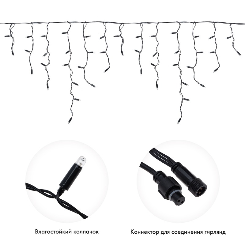 Благодаря использованию в гирлянде светодиодов, ее отличительной особенностью является превосходная яркость и низкое энергопотрбление по сравнению с лампами накаливания.