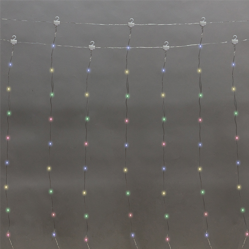 Светодиодный дождь легко повесить на штору, тюль или карниз благодаря пластиковым крючкам.
