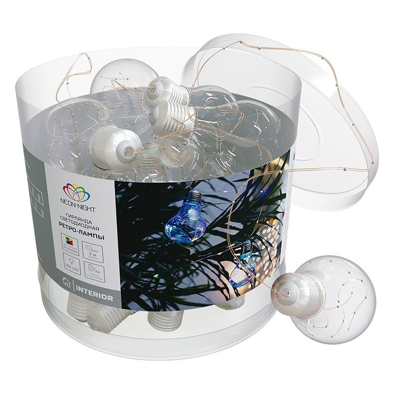 Гирлянда «Ретро-лампы» длиной 3 метра — необычное, стильное интерьерное украшение, которое разнообразит обстановку не только в новогодние праздники, но и в будни. Изделие представляет собой гибкий шнур, на котором находятся 100 диодов, светящихся разноцветными огнями. Дополнительно на кабеле расположены 10 насадок в виде аутентичных ламп накаливания с серебристым цоколем, эффектно подсвечиваемые диодами изнутри. Гирлянда не нуждается в подключении к стандартной электросети: питается от 3 батареек типа АА, что говорит об абсолютной безопасности использования.