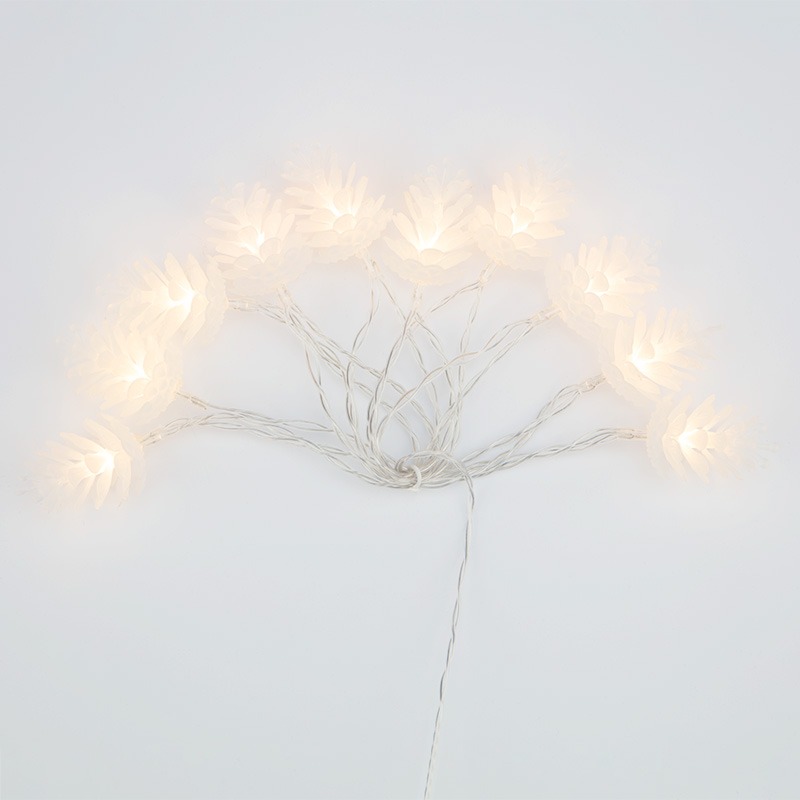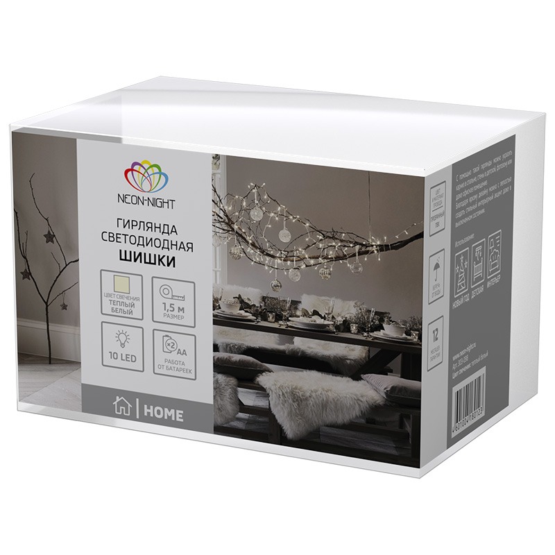 Светодиодная гирлянда «Шишки» длиной 1,5 метра гармонично дополнит яркий праздничный наряд новогодней ели. Серебристый провод, изолированный внешней оболочкой из прозрачного ПВХ, прекрасно смотрится в декоре искусственных елочек нестандартных цветов. 10 насадок в виде шишек, изготовленных из термостойкого пластика, ярко подсвечиваются диодами. Блок для элементов питания имеет небольшие размеры и закрывается плотной крышкой. Диоды излучают приятный белый свет теплого оттенка и питаются от двух батареек типа АА. Гирлянда, не требующая подключения к стандартной электрической сети — это безопасное решение для декорирования детских комнат.