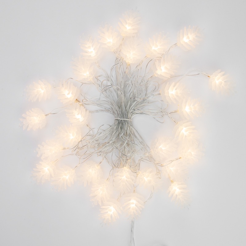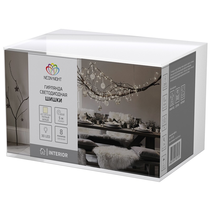 Светодиодная гирлянда «Шишки» длиной 5 метров — это эффектное украшение для новогодней ели, выполненное в традиционной новогодней тематике. 30 насадок в виде шишек находятся на электрическом кабеле на расстоянии 16 см друг от друга. Диоды, излучающие яркий белый свет теплого оттенка, получают питание от сети 230 В и управляются контроллером с 8 режимами. Смена динамики свечения создаст уникальное настроение и заразит весельем окружающих. Длина питающего шнура 1,2 метра. Защита IP20 предполагает использование в сухих отапливаемых помещениях.