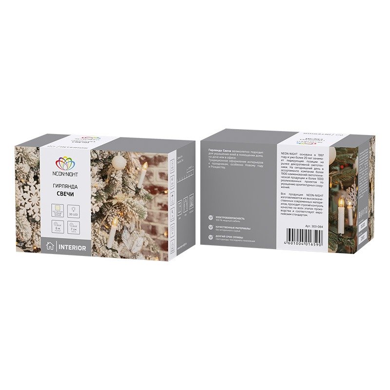 Гирлянда «Свечи» представляет собой провод длиной 6 метров, помещенный в гибкую изоляцию из темно-зеленого ПВХ, на котором расположены 30 фигур в виде свечей со светодиодами, размер свечи — 7 см. Украшение идеально подходит для оформления новогодних елок и представляет собой символ Рождества. Каждая свечка излучает теплый белый свет, имитируя пламя на кончике фитиля. Для закрепления элементов на ветках предусмотрены пластиковые клипсы, которые надежно фиксируют фигурки в нужном положении. Защита IP20 предполагает использование гирлянды в отапливаемых помещениях с умеренной влажностью. Для подключения в розетку предусмотрен 3-метровый шнур.