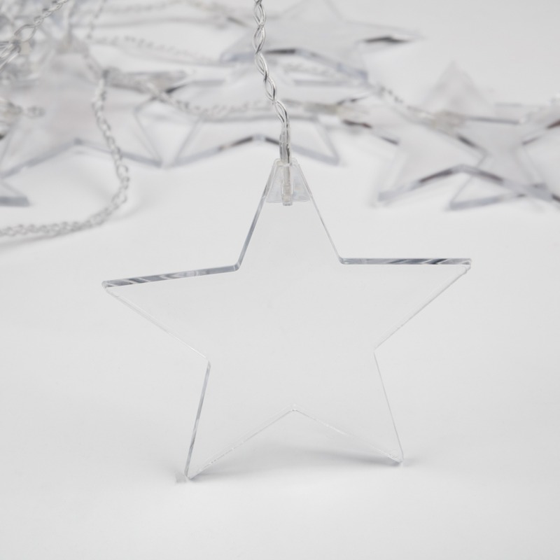 Гирлянда «Звезды» длиной 1,5 метра выполнена в виде бахромы. 10 диодов излучают белый свет теплого оттенка. Светодиоды не нагреваются, не вырабатывают вредный для зрения спектр и экономно потребляют электроэнергию. Вертикальные нити длиной 40 и 60 см удерживают 10 волшебных звезд размером 11,5 см. Гирлянда с ассиметричными нитями с защитой IP20 предназначена для использования в сухих отапливаемых помещениях и станет прекрасным украшением окна, арки, открытого дверного проема, свободного пространства между комнатами. Для подключения к розетке предусмотрен 3-метровый питающий шнур.