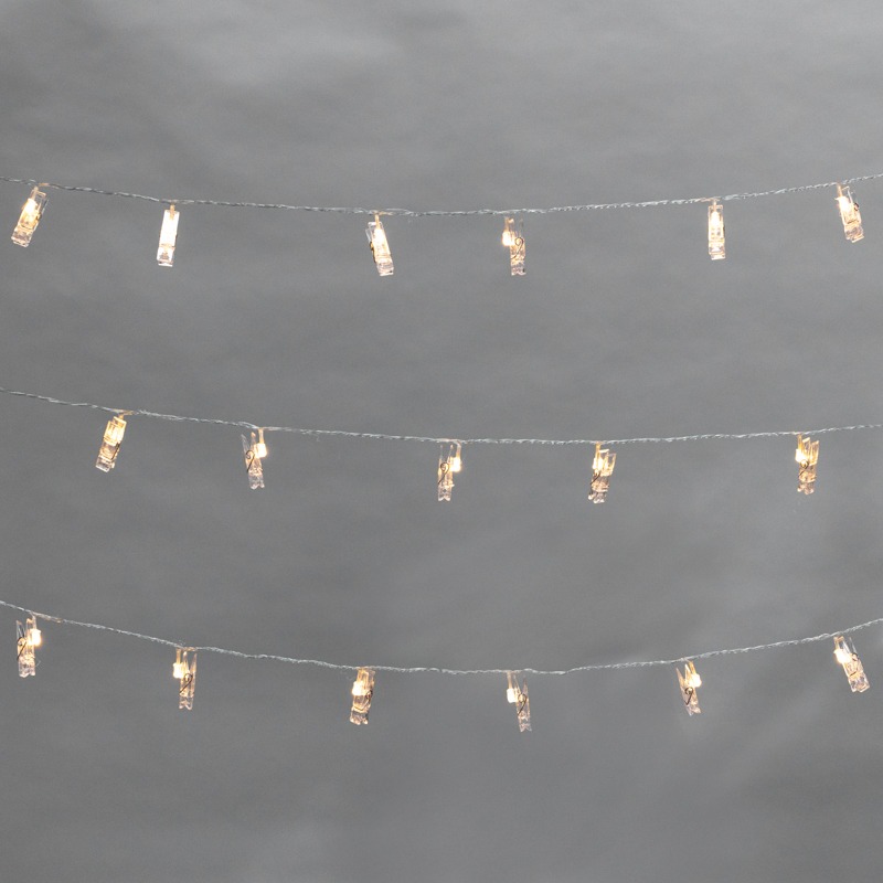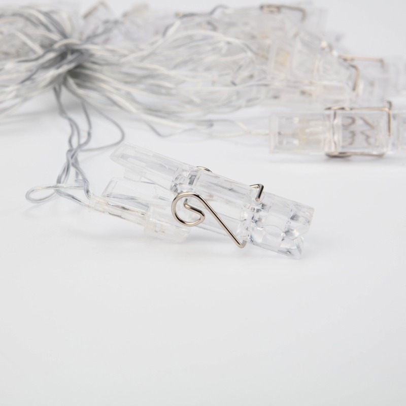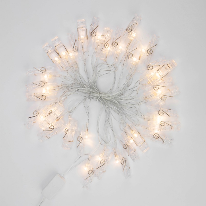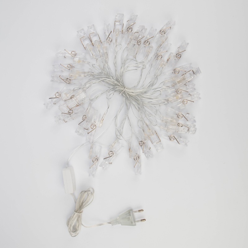 Светодиодная гирлянда «Прищепки» — эффектный декор интерьера, который поможет разнообразить обстановку и создаст атмосферу уюта. На проводе длиной 5,2 метра располагаются 30 диодов, излучающих белый свет теплого оттенка. Каждый элемент имеет пластиковую прищепку, к которой можно прикрепить фото, картинку или другие легкие элементы декора. Гирлянда IP20 подходит для оформления новогодних елей, оконного текстиля, мебели и предполагает использование в помещениях с естественной влажностью воздуха. Изделие работает от сети 230 В, для подключения в розетку предусмотрен питающий шнур длиной 3 метра.