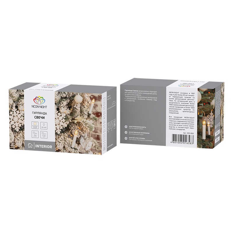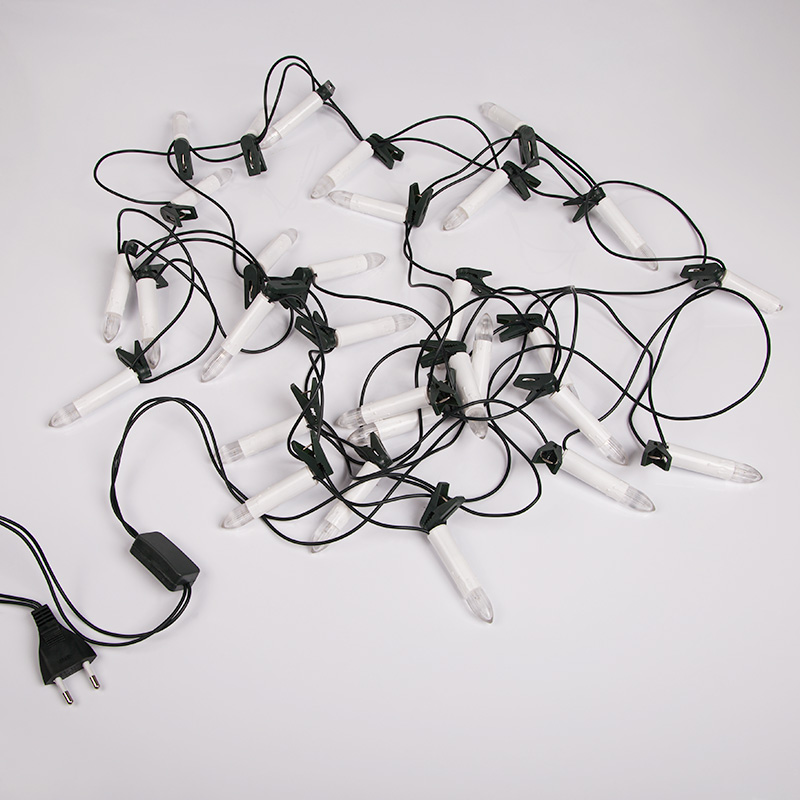 Гирлянда «Свечи» выполнена в виде провода в изоляционной оболочке из темно-зеленого ПВХ длиной 4 метра, на котором расположены 20 фигур в виде свечей со светодиодами, размер свечи — 7 см. Диоды излучают белый свет теплого оттенка, имитирующий пламя на кончике фитиля. Каждая свечка сопровождается пластмассовой клипсой-прищепкой, которая позволяет закрепить фигурки на ветках новогодней ели в нужном положении. Для подключения в розетку в любом удобном месте предусмотрен трехметровый электрический кабель. Гирлянда светится в постоянном режиме.