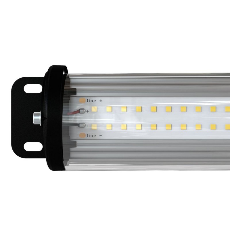Светильник «Лайтбар» представляет собой трубку из боросиликатного закаленного стекла (толщина 4 мм) с торцевыми крышками из литого алюминия. Крышки покрываются порошковой краской (базовый цвет – черный, опционально – любое покрытие из каталога RAL) и герметизируются литыми силиконовыми прокладками.