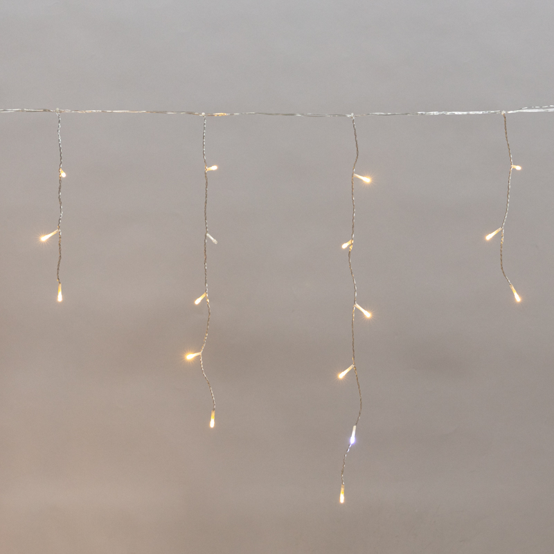 На каждой нити располагаются светодиоды, создающие эффект сверкающих сосулек. Цвет свечения – теплый белый.