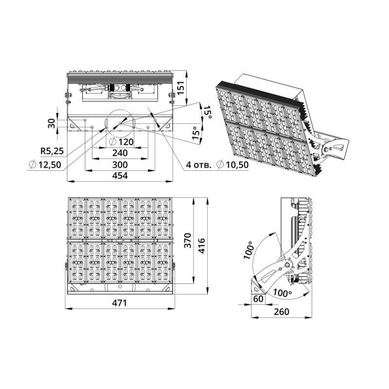 В комплекте идёт кронштейн, который позволяет регулировать угол наклона светильников. Специальные зубцы на кронштейнах дополнительно облегчают регулировку положения прожектора.