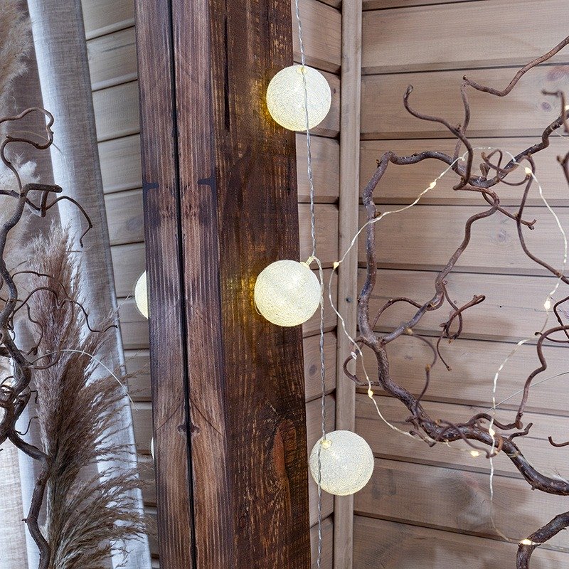 Тайские фонарики «Пломбир» — это эффектная светодиодная гирлянда с оригинальным дизайном и необычным исполнением. На проводе, изолированном прозрачным ПВХ, находятся 10 волшебных фонариков, выполненных из хлопковой тонкой нити. Расположенные внутри диоды ярко подсвечивают купол, который создает эффект рассеивания. Гирлянда, питающаяся от 2 батареек АА, подходит для оформления гостиной, спальни, детской, обеденной зоны и предоставляет широкие возможности применения благодаря независимости от розетки и абсолютной безопасности.