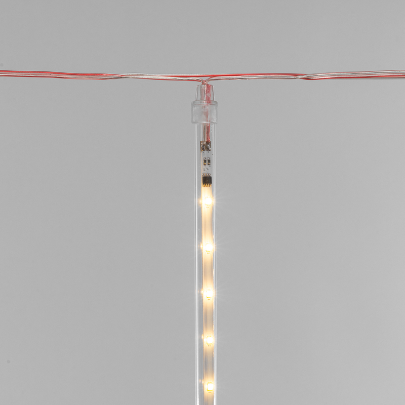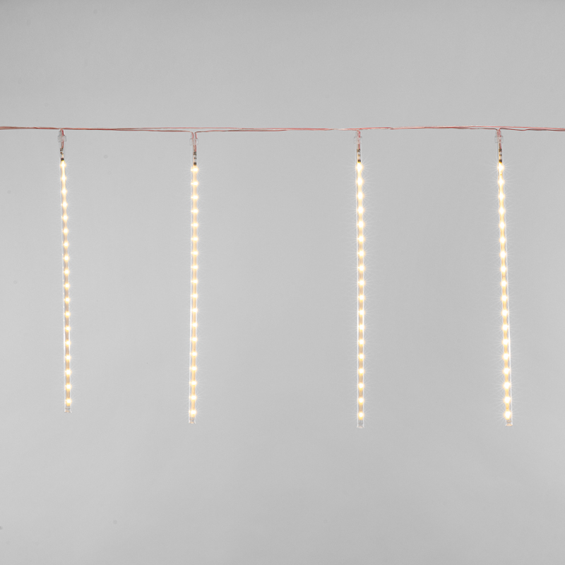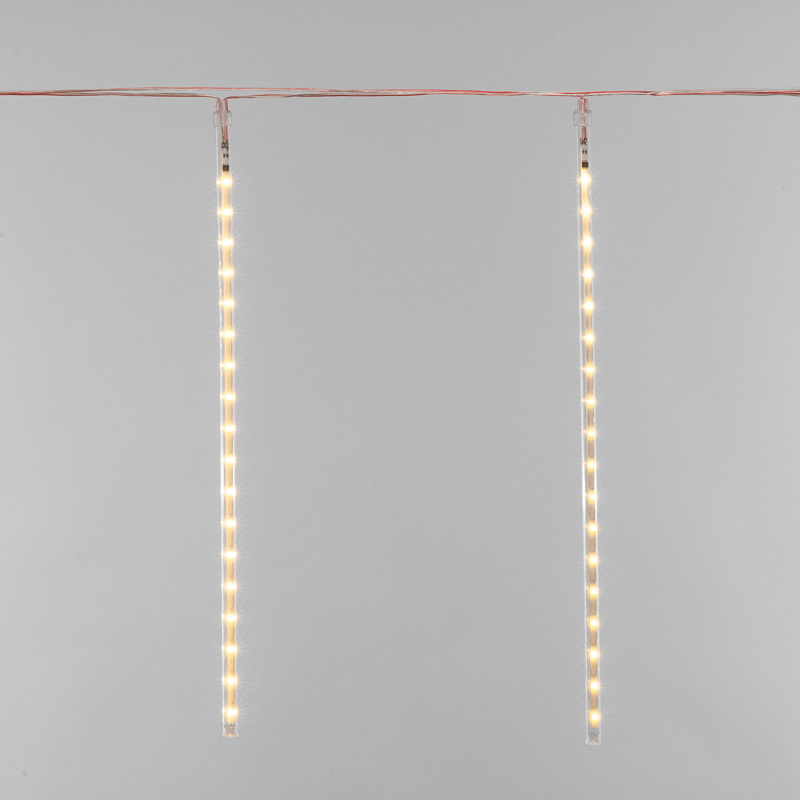 Гирлянда «Тающие сосульки» — это необычное светодиодное украшение, которое представляет собой серебристый провод в прозрачной оболочке из ПВХ, с расположенными на нем 8 декоративными элементами в виде сосулек. Каждая трубка имеет длину 50 см и содержит внутри плату с диодами, управляемую микрочипом. Светодинамический эффект имитирует стекающую каплю. Гирлянда обладает защитой IP20 и подходит для использования в помещениях с естественной влажностью. Длина питающего шнура — 1.5 метра. Для подключения в сеть с напряжением 230 В
