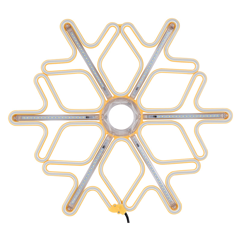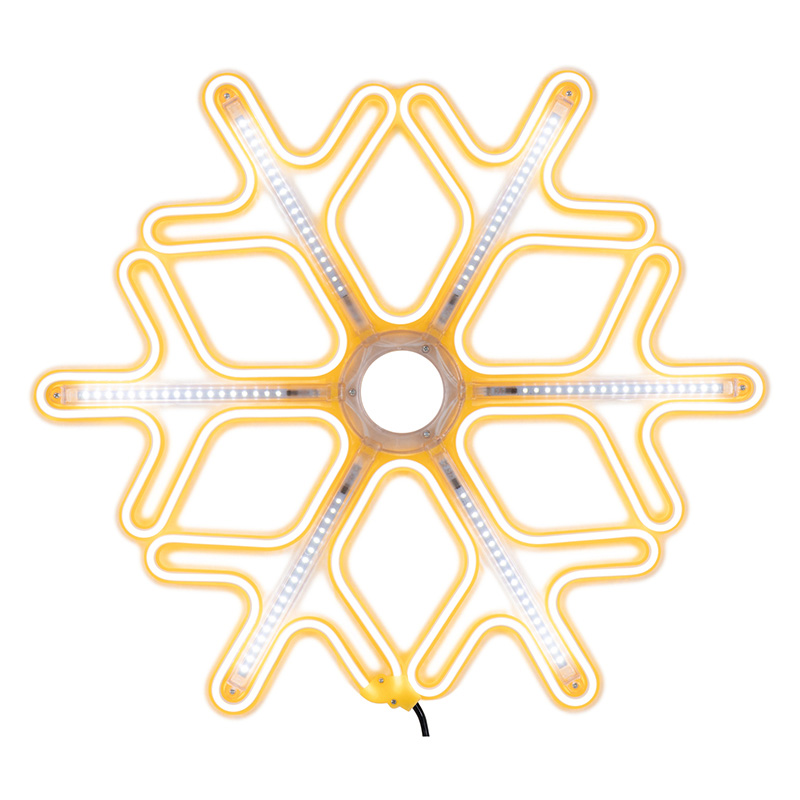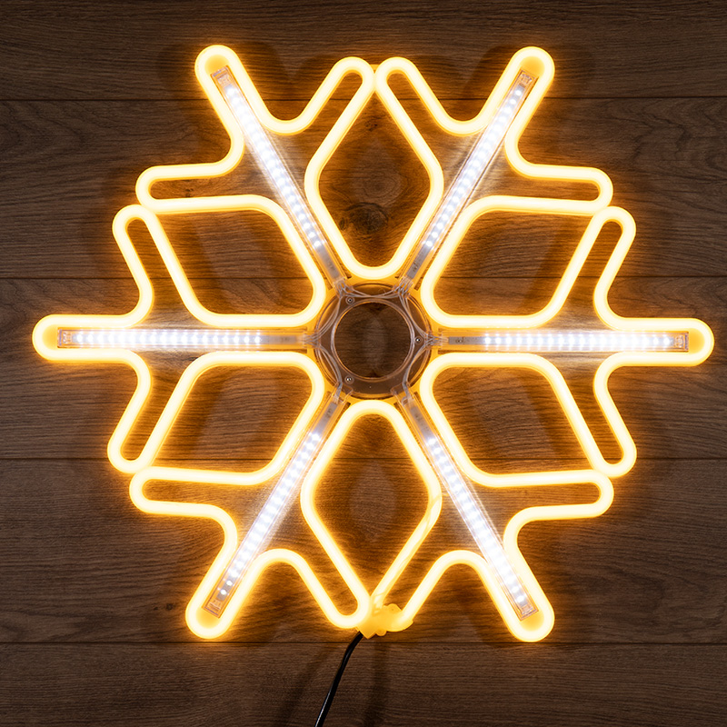 «Снежинка» имеет размер 60х60 см, выполнена из теплого белого неона и белых светодиодных лучей.