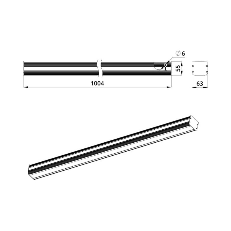 Экструдированный корпус изготовлен из анодированного алюминия. Его конструкция специально разработана для простого и удобного подвесного монтажа светильников в единую линию.