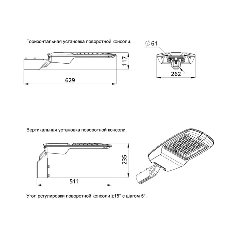 Светильники оснащены поворотным креплением, которое позволяет устанавливать их как на консольную, так и на торшерную опору. Крепление позволяет регулировать угол наклона светильника в диапазоне ±15° с шагом 5°.