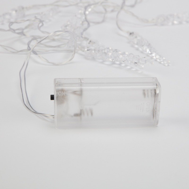 Светодиодная гирлянда «Сосульки» длиной 1,5 метра — идеальное решение для создания праздничного декора в преддверии Нового года. 10 насадок в виде сосулек ярко подсвечиваются диодами, которые излучают теплый белый свет. Необычный дизайн, тематическое исполнение, независимость от электрической сети и абсолютная безопасность открывают большие возможности в оформлении интерьера. Гирлянда питается от двух элементов типа АА, для которых предусмотрен отдельный блок с крышкой и клавишей ON/OFF. Изделие IP20 предназначено для использования дома, в офисе, магазине и других помещениях со стандартными условиями.