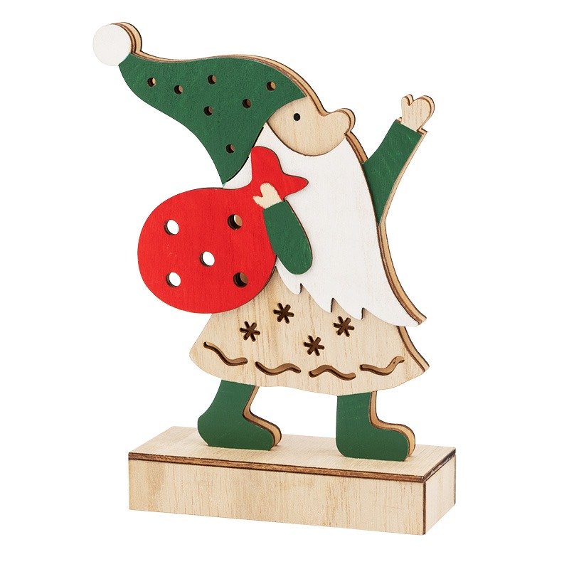 Деревянная фигурка с подсветкой «Дед Мороз» высотой 18 см работает от двух батареек типа ААА, поэтому ее можно разместить в любом уголке вашего дома, не уделяя внимание поиску розеток. Изделие, произведенное из экологичных материалов, станет прекрасным подарком к новогодним праздникам, который вызовет только приятные эмоции. 5 экономичных диодов теплого белого свечения мягко обрамляют композицию, создавая атмосферу тепла и уюта. Фигурка предназначена для использования в помещениях с умеренной влажностью.