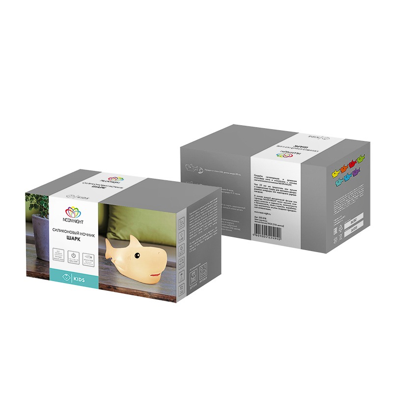 Силиконовый ночник «Шарк» – эффектный дизайнерский ночник в форме милой акулы. Выполнен из приятного на ощупь силикона. Забавный персонаж придется по душе каждому ребенку, станет его лучшим другом, который поможет быстро и крепко заснуть. Ночник светится теплым белым цветом, плавно меняет оттенки RGB-диодов или светится одним цветом из 256 вариантов. Изделие не нагревается, не имеет неприятного запаха, острых углов и опасных деталей. Ночник заряжается через USB-порт, одного объема аккумулятора хватает на 9-11 часов. Режимы переключаются легким хлопком по корпусу.