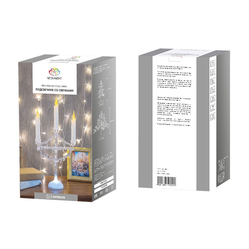 Фигура на подставке «Подсвечник со свечками» высотой 50 см — эффектный интерьерный декор, который не только гармонично украсит обстановку, но и станет полноценным функциональным предметом. 1 белый и 3 желтых светодиода создают эффект плавно движущегося огня на кончике фитилей. Питание от 3 мизинчиковых батареек (типа ААА). Композиция выполнена из белого и прозрачного пластика в виде подсвечника с 3 декоративными свечами. В нижней части подставки расположены батарейный модуль и кнопка ON/OFF.