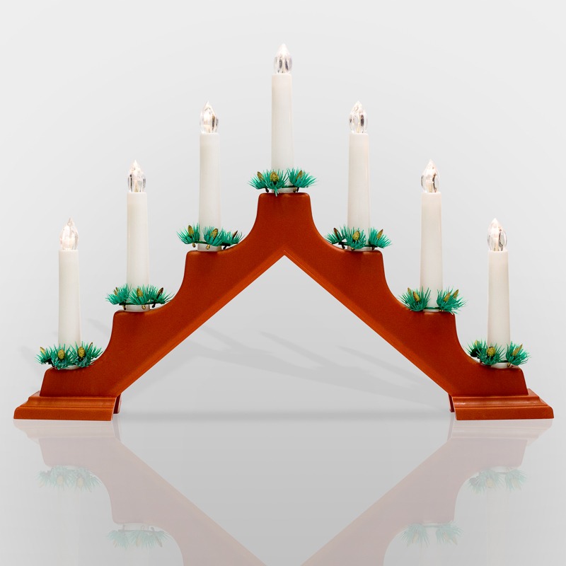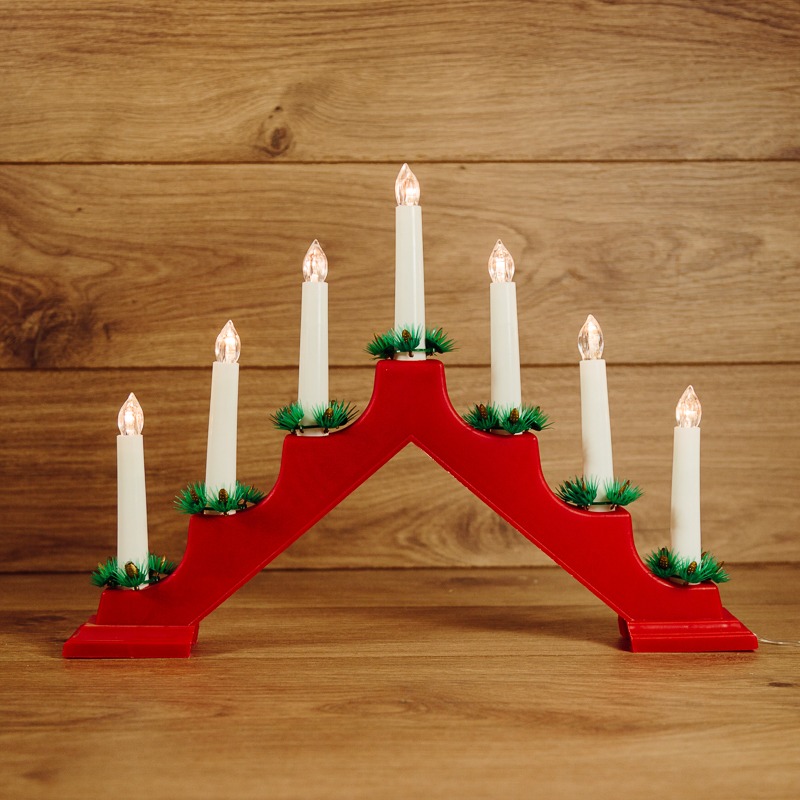Новогодняя горка красного цвета с 7 свечками гармонично украсит интерьер, создаст атмосферу уюта, тепла и комфорта. Декор в виде подсвечника поможет эффектно оформить праздничный стол, при этом не нужно опасаться возгорания или капающего воска – пластиковые свечки излучают теплый белый свет при помощи безопасных диодов. Они не нагреваются, служат долгое время и экономно расходуют электроэнергию. Сетевой кабель длиной 1,5 метра позволяет подключить горку в любом удобном месте – удлинитель не потребуется.