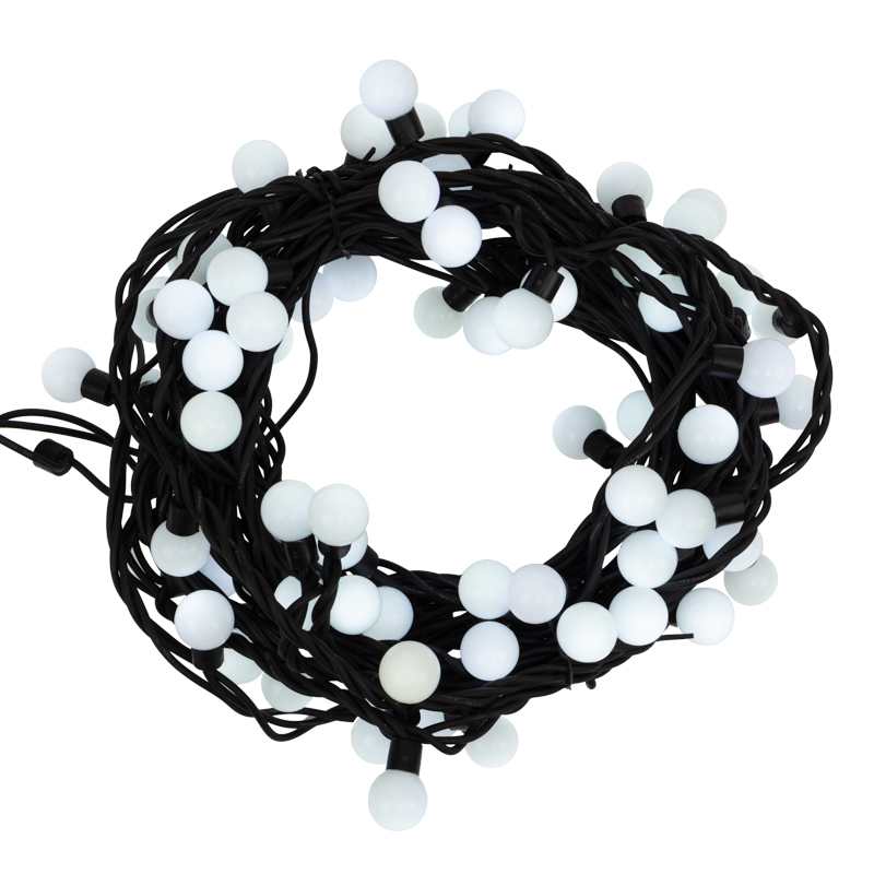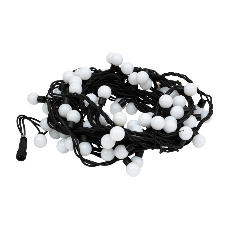 Гирлянда Мультишарики представляет собой провод, на котором располагаются сверхъяркие светодиоды с шагом 10 см. На светодиодах находятся насадки в виде шариков диаметром 23 мм.