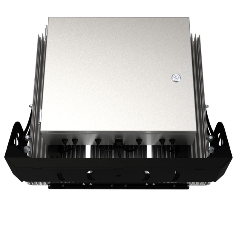 Источник питания наружного исполнения, его металлический корпус залит теплопроводящим компаундом. За счет этого снижается нагрев светодиодного модуля и самого источника питания, поэтому светильник служит дольше. Также источник защищен от микросекундных импульсов высокой энергии. Это позволяет сохранять работоспособность светильника даже при появлении в сети посторонних помех.