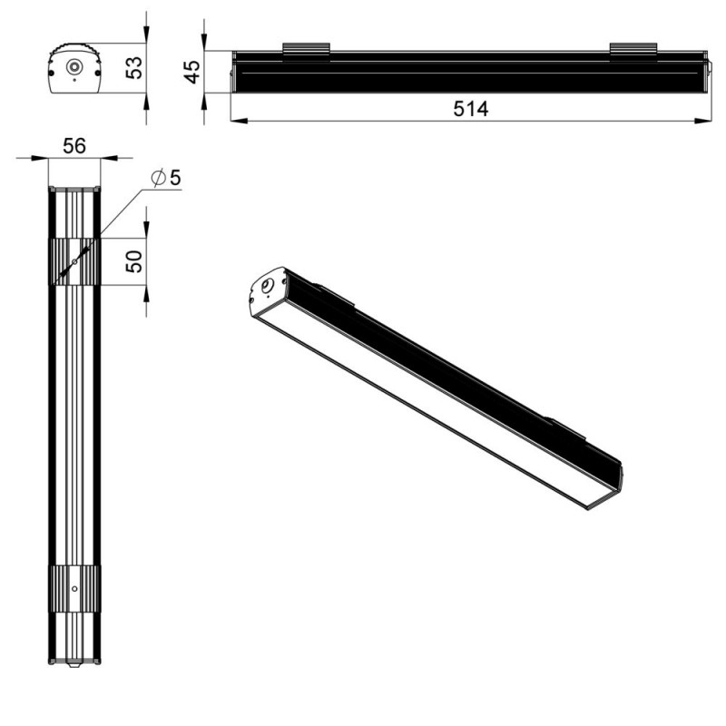 Световая отдача серии достигает 180 лм/Вт. Светильники представлены в четырех типоразмерах – 300, 500, 1000 и 1500 мм.