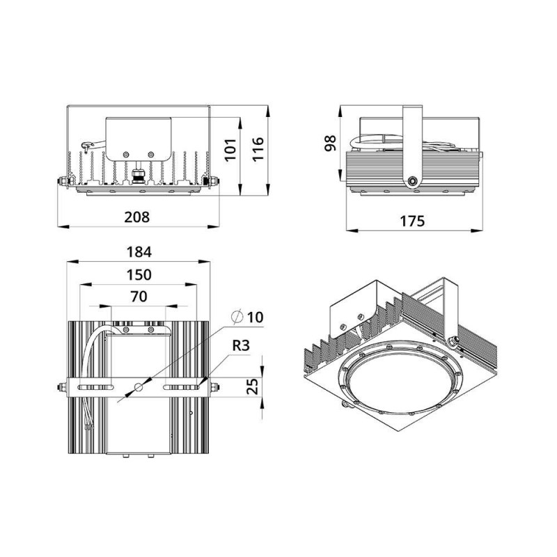 Литой герметичный (IP66) короб из алюминиевого сплава предназначен для размещения источников питания, узла подключения и дополнительного оборудования (например, модулей системы управления). Короб покрыт порошковой краской в цвет корпуса.