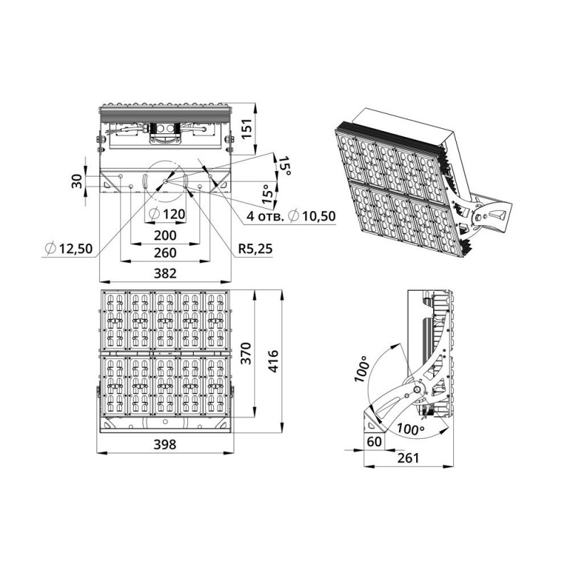 В комплекте идёт кронштейн, который позволяет регулировать угол наклона светильников. Специальные зубцы на кронштейнах дополнительно облегчают регулировку положения прожектора.
