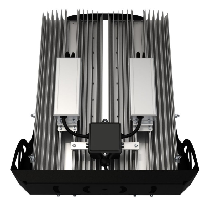 Источник питания наружного исполнения, его металлический корпус залит теплопроводящим компаундом. За счет этого снижается нагрев светодиодного модуля и самого источника питания, поэтому светильник служит дольше. Также источник защищен от микросекундных импульсов высокой энергии. Это позволяет сохранять работоспособность светильника даже при появлении в сети посторонних помех.
