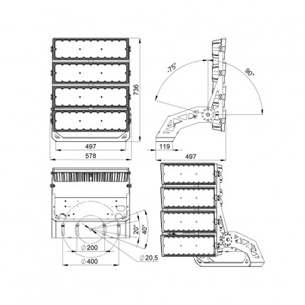 За счет конструкции радиаторной части прожекторы мощностью 400 и 500 Вт на один модуль имеют оптимальное сочетание массы, габаритов и цены за люмен, что особенно важно при выборе светильников для установки на высокомачтовые опоры.