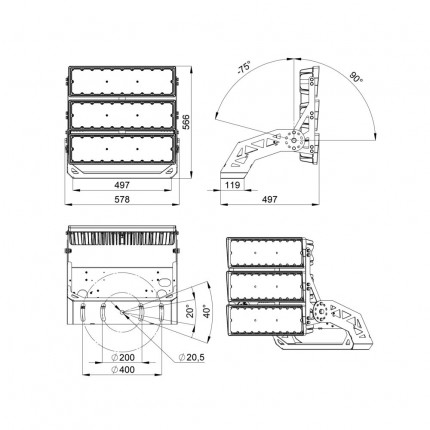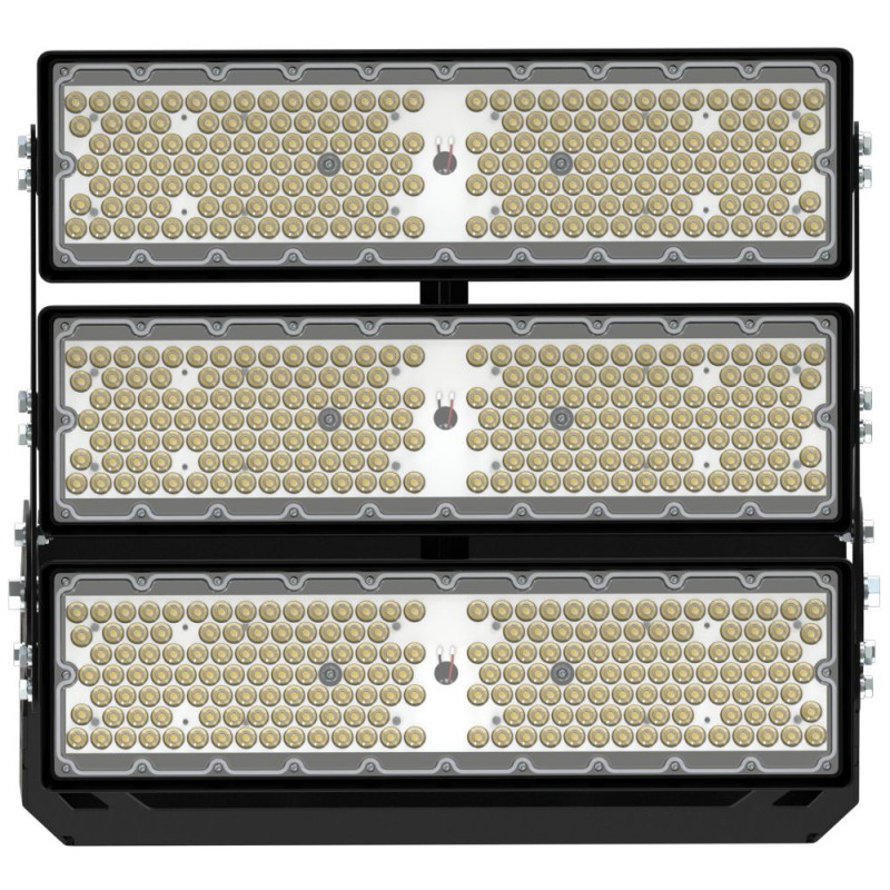 За счет конструкции радиаторной части прожекторы мощностью 400 и 500 Вт на один модуль имеют оптимальное сочетание массы, габаритов и цены за люмен, что особенно важно при выборе светильников для установки на высокомачтовые опоры.