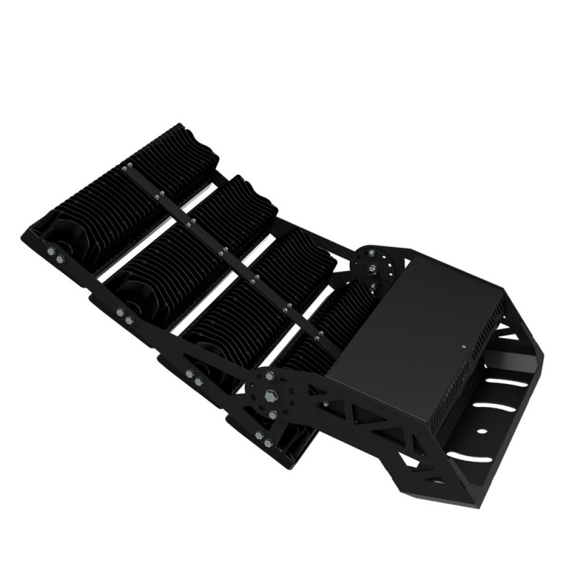 За счет конструкции радиаторной части прожекторы мощностью 400 и 500 Вт на один модуль имеют оптимальное сочетание массы, габаритов и цены за люмен, что особенно важно при выборе светильников для установки на высокомачтовые опоры.