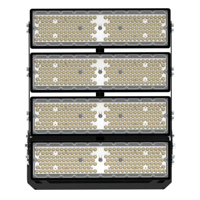 За счет конструкции радиаторной части прожекторы мощностью 400 и 500 Вт на один модуль имеют оптимальное сочетание массы, габаритов и цены за люмен, что особенно важно при выборе светильников для установки на высокомачтовые опоры.
