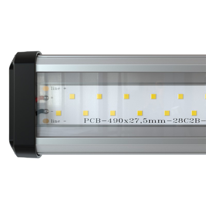 В светильниках «Т-Линия Компакт Низковольтный» используются светодиодные планки на специальной алюминиевой подложке, изготовленные по технологии SMT. Светодиодная планка максимально приближена к рассеивателю, чтобы сократить потери светового потока.